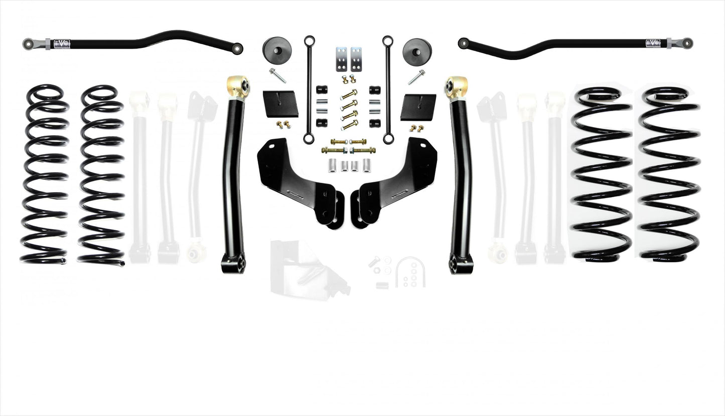 The EVO MFG 2.5 inch JL Enforcer Overland Kits are easy to install using normal tools. No drilling or cutting (optional rear shock extensions require one minor drill). They require no driveshaft or exhaust modifications (your shock choice may require this, contact manufacturer to be sure).