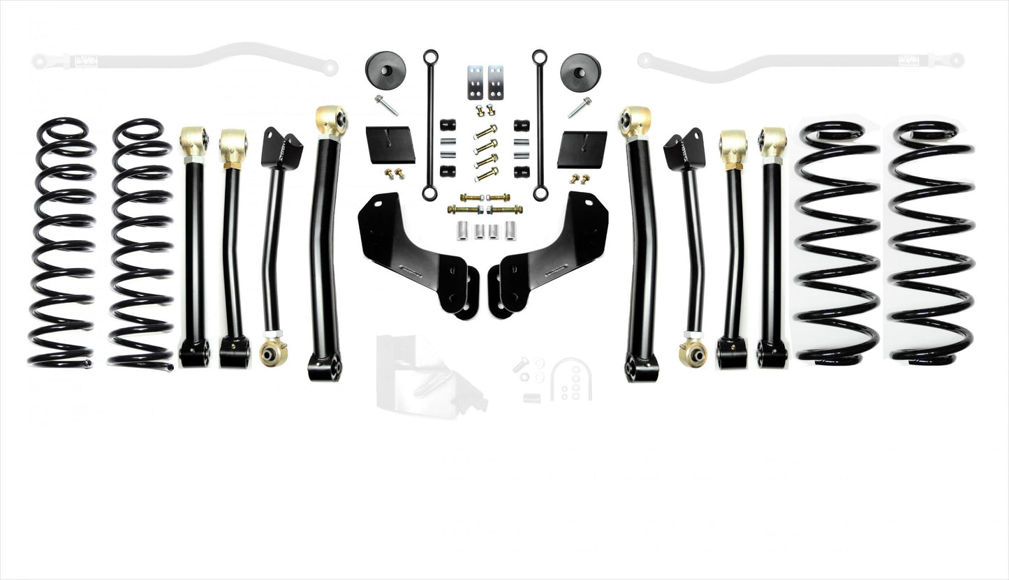 The EVO MFG 2.5 inch JL Enforcer Overland Kits are easy to install using normal tools. No drilling or cutting (optional rear shock extensions require one minor drill). They require no driveshaft or exhaust modifications (your shock choice may require this, contact manufacturer to be sure).