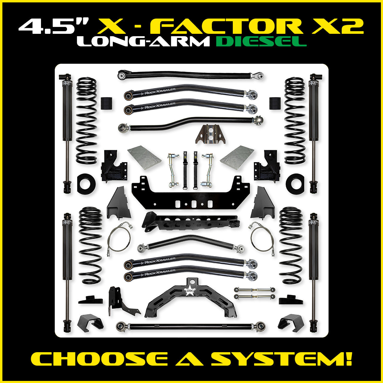 The Rock Krawler 4.5" X-Factor X2 Long-Arm (Diesel) System is specifically designed for Gladiator owners who want to push their vehicle to its limits with hard core rock crawling. The Rock Krawler X2 3-Link Longarm System features an Independent 3 link design front & rear for maximum articulation and off-road performance. Our proprietary design utilizes a double adjustable front and rear upper control arm that upsizes the factory hardware to 14mm, 2 3/8" mounting width and 1" Pro Krawler joints at each end. The arm itself is a chromoly solid steel arm meant to carry all the forces of the suspension. The rear suspension provides adjustable anti-squat with "X2" rear suspension geometry with enhanced rear instant center(s) and rear roll center(s). As you drive the highways or the trails, the system feels stable, safe and strong whether you are running the stock drivetrain or pushing high horsepower through the chassis. We have built the X-Factor X2 system to be the toughest 3-Link setup on the market. At the frame connections of the lower control arms, our "Adventure Series" maintenance free joint is used to cut down on the amount of grease points, and provide excellent vibration absorption and proper joint misalignment when off-road. The combination of high clearance long arms and 3 link suspension geometry lets you dominate the trails. When we design a system, our goal is to provide you with the most comprehensive solution and the best geometry, install exceptional value, and be the foundation for every adventure whether it be on the Street, In tow, or down a Trail! Thank you for considering Rock Krawler Suspension.