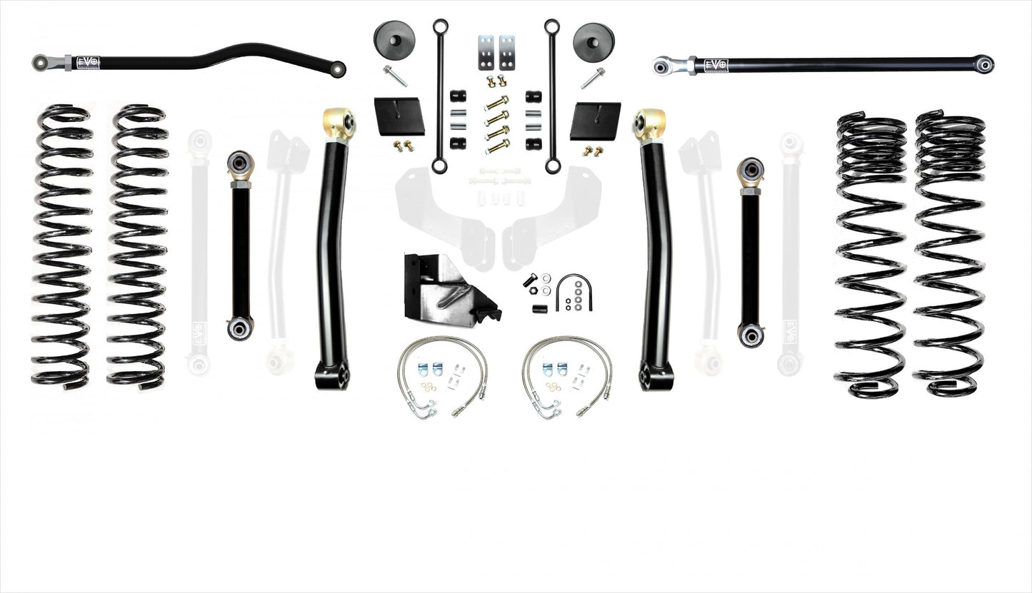 These kits come with a set of 4.5 inch lift springs specific to each corner which will keep the Jeep Gladiator JT level side to side. The EVO MFG 4.5 inch JT Enforcer Kits are easy to install using normal tools. No drilling or cutting. They require no driveshaft or exhaust modifications. Simple Bolt on installation. EVO MFG JT Enforcer kits are available in multiple configurations to suit your needs and budget and are upgradable down the road.