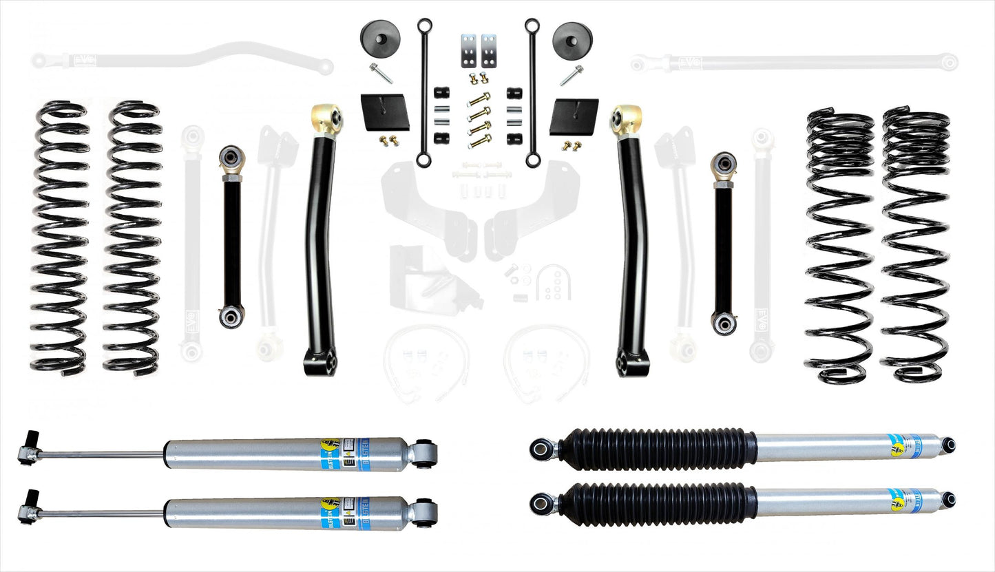These kits allow for use of your choice of any aftermarket 2.5-5 inch lift shock or use of our EVO SPEC tuned 2.5 inch Remote Reservoir King Shocks. These kits come with a set of 2.5 inch lift springs specific to each corner which will keep the Jeep Gladiator JT level side to side.