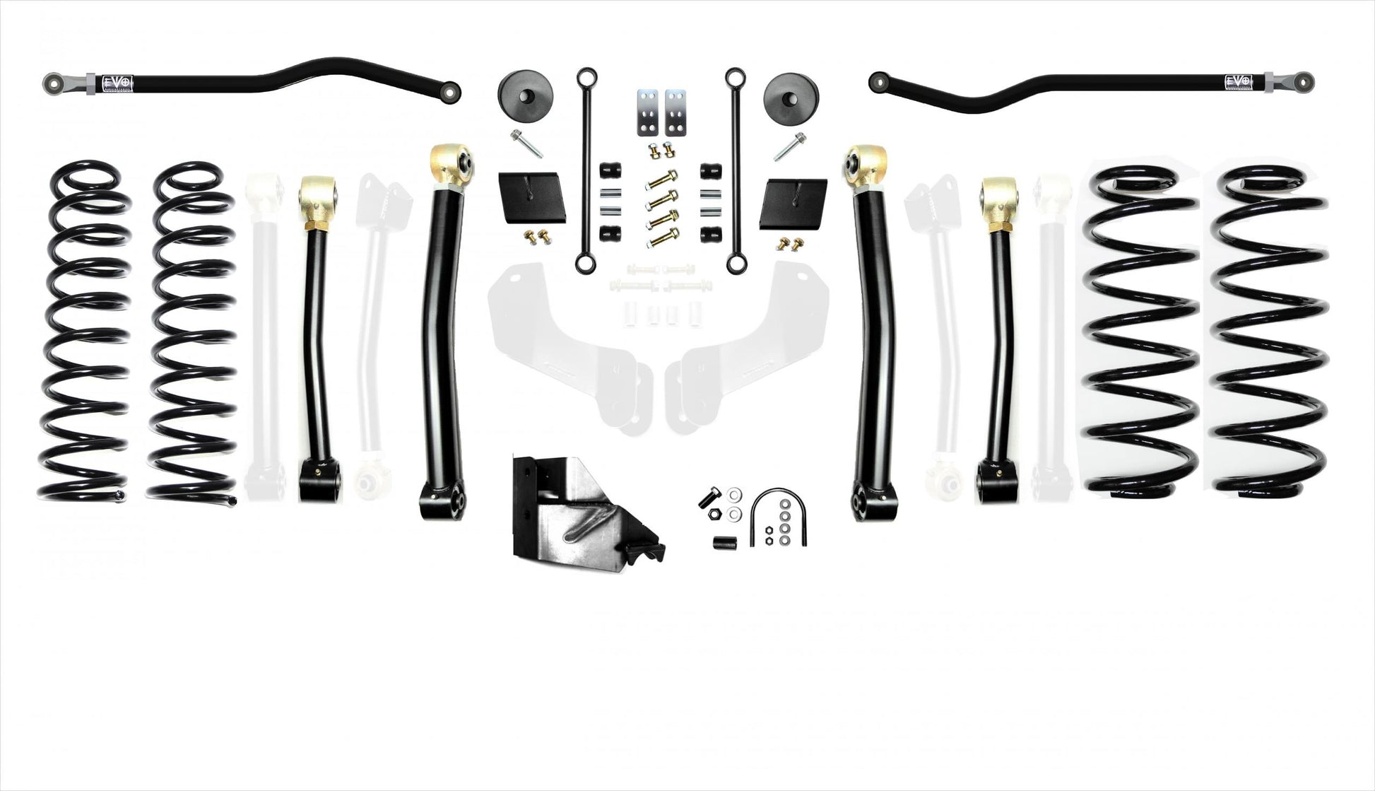 - Stage 2 kits includes stage 1 components as well as EVO MFG Enforcer JL Front Lower Adjustable Control Arms to allow for caster adjustments.