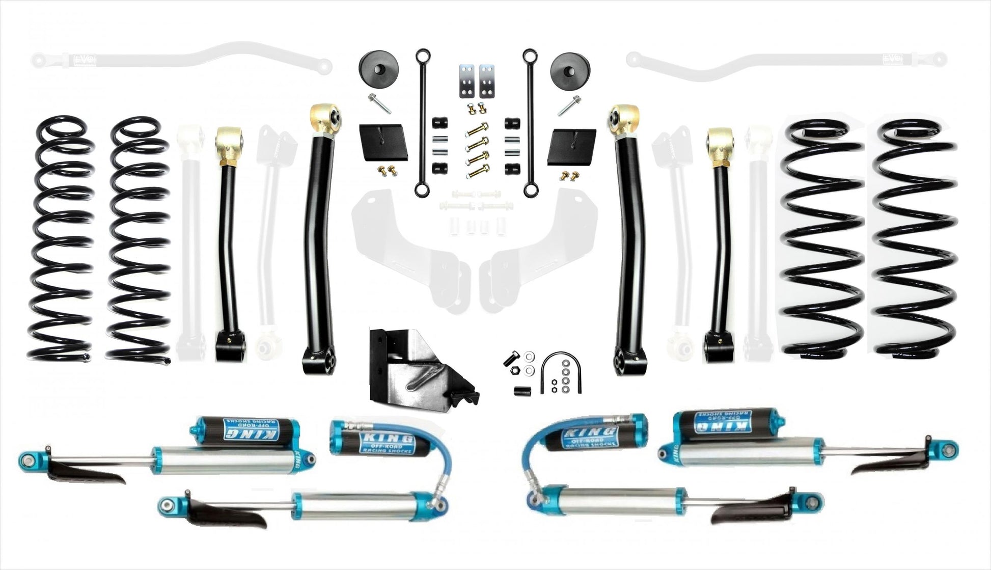 Stage 3 Kits Includes stage 2 components as well as EVO MFG Enforcer rear upper adjustable control arms for rear pinion angle adjustment. All part number EXT kits include front and rear shock extensions. Kits include EVO SPEC King Shocks. Retaining factory shocks while maintaining full wheel travel.